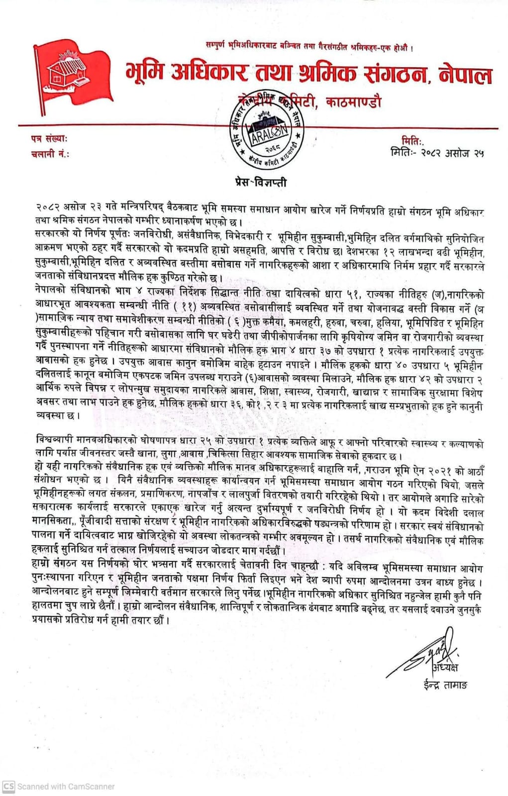 संगठनका अध्यक्ष इन्द्र तामाङद्वारा जारी गरिएको प्रेस विज्ञप्तिमा भनिएको छ, “२०८२ असोज २३ गतेको मन्त्रिपरिषद् बैठकले आयोग खारेज गर्ने निर्णय गरेर संविधानमा उल्लेखित नागरिकका मौलिक हक कुण्ठित गरेको छ। उक्त निर्णय सरकारको पूँजीवादी प्रवृत्तिको प्रतिबिम्ब हो र यो भूमिहीन, सुकुम्बासी, दलित तथा अव्यवस्थित बस्तीमा बसोबास गर्ने करिब १२ लाख नागरिकमाथिको विभेदकारी र अमानवीय व्यवहार हो।”