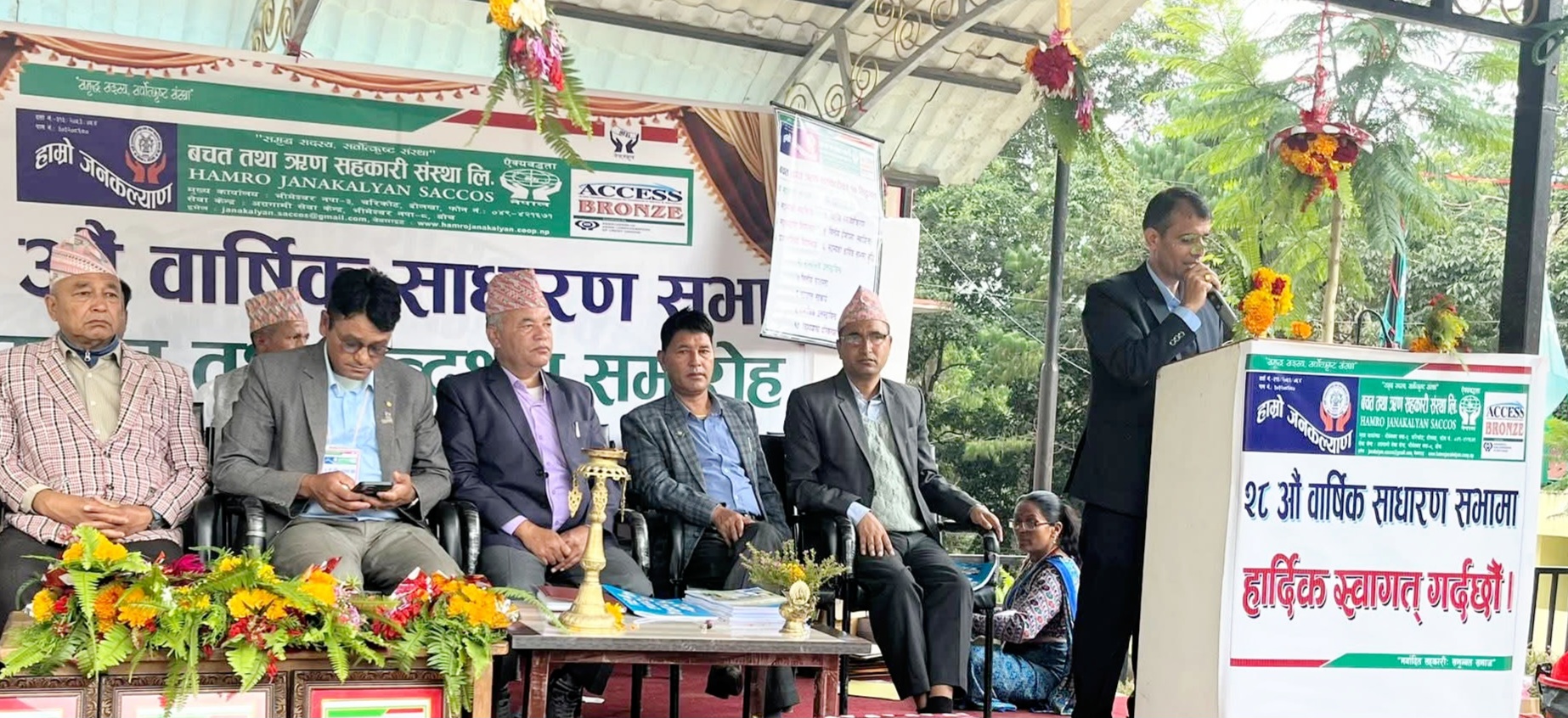 अगेनो सम्वादाता ः असोज ४- दोलखाको सदरमुकाम चरिकोटमा रहेको हाम्रो जनकल्याण बचत तथा ऋण सहकारी संस्थाको २८ औँ वार्षिक साधारण सभा आज सदरमुकाम चरिकोटमा सम्पन्न भएको छ । सहकारी संस्थाका अध्यक्ष राजन श्रेष्ठको अध्यक्षतामा भएको साधारण सभामा संस्थाका सचिव अनिल रिजालले वार्षिक प्रगति प्रतिवेदन प्रस्तुत गर्नुभएको थियो भने कोषाध्यक्ष सर्मीला थापाले ९४ करोड २४ लाख ९५ हजार ३ सय ३३ रुपैयाँ ६६पैसा बराबरको आर्थिक प्रतिवेद प्रस्तुत गर्नुभएको थियो । साधारण सभाको अवसरमा उत्कृष्ठ शेयर सदस्यहरु,उत्कृष्ट बचतकर्ता,उत्कृष्ठ ऋणी लगायतलाई सम्मान गरिएको छ । साधारण सभामा बागमती प्रदेश बचत तथा ऋण सहकारी संघका वरिष्ठ उपाध्यक्ष जिवसराज खड्का, जिल्ला सहकारी संघ दोलखाका अध्यक्ष देवीप्रसाद शर्मा,जिल्ला बचत तथा ऋण सहकारी संस्थाका अध्यक्ष भुमीराज खड्का, सहकारी संस्थाका प्रमुख कार्यकारी अधिकृत दिपक बस्नेत लगायतले मन्तव्य व्यक्त गर्नुभएको थियो । वार्षिक साधारण सभाको अवसरमा शेयर सदस्यहरुले भजन प्रस्तुत गर्नुभएकोे थियोे । सहकारीमा हाल महिला सदस्य ५ हजार २ सय १८ जना र पुरूष ४ हजार ६ सय ३० गरि ९ हजार ८ सय ८५ जना शेयर सदस्य र ३ हजार ७ सय ६८ जना बालबचत कर्ता रहनुभएको छ ।