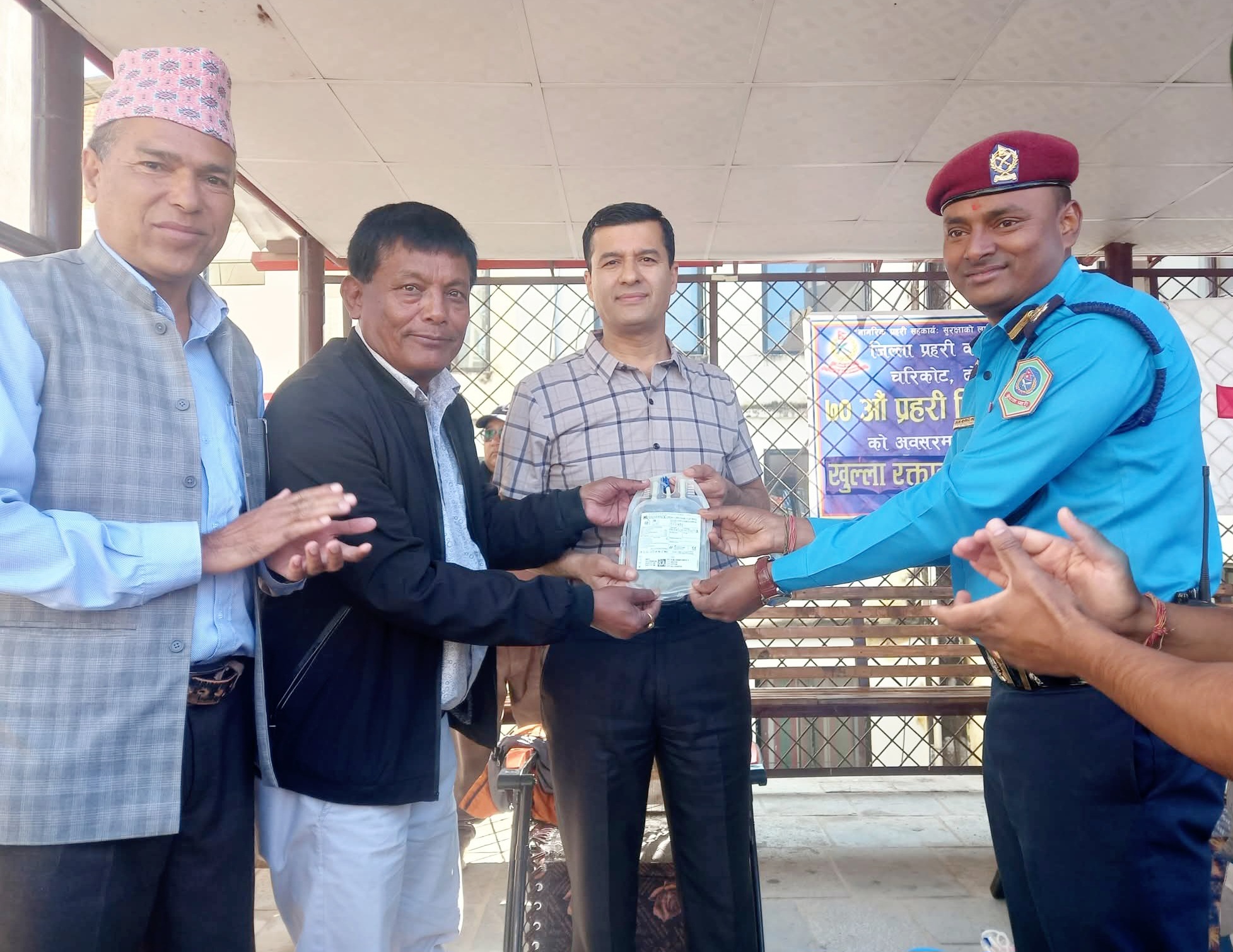 अगेनो सम्वादाता ः असोज २९- ७० औं प्रहरी दिवसको अवसरमा दोलखाको सदरमुकाम चरिकोटमा रक्तदान कार्यक्रम आयोजना गरिएको छ । प्रहरी दिवसको अवसरमा आज जिल्ला प्रहरी कार्यालय दोलखाको आयोजना र नेपाल रेडक्रस सोसाईटी जिल्ला शाखा दोलखाको प्राविधिक सहयोगमा जिल्लाको सदरमुकाम चरिकोटमा रक्तदान कार्यक्रम गरिएको रक्तसञ्चार समिति दोलखाका संयोजक गोकर्ण प्रसाद पोखरेलले जानकारी दिनुभयोे । उहाँँका अनुसार दोलखाका प्रमुख जिल्ला अधिकारी भोला दाहाल सहित ३२ जनाले रक्तदान गर्नु गर्नुभएको थियो । जिल्लामा रगतको अभाव हुन नदिनका लागि कार्यतालिका बनाएर नै रक्तदान कार्यक्रम हुदैँ आएको छ ।