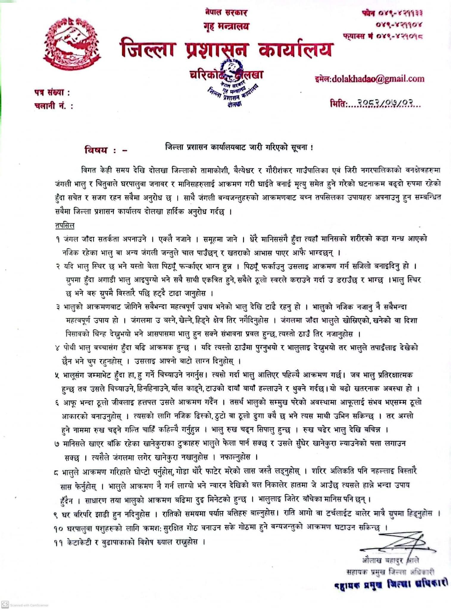 अगेनो सम्वादाता ः कात्तिक ३ -विगत केहि समय देखि दोलखा जिल्लाको तामाकोशी, बैत्येश्वर र गौरीशंकर गाउँपालिका एवं जिरी नगरपालिकाको वनक्षेत्रहरुमा जंगली भालु र चितुवाले घरपालुवा जनावर र मानिसहरुलाई आक्रमण गरी घाईते वनाई मृत्यु समेत हुने गरेको घटनाक्रम वढ्दो रुपमा रहेको हुँदा सचेत र सजग रहन सवैमा अनुरोध छ । ति वन्यजन्तुहरुको आक्रमणवाट वच्न निम्न उपायहरु अपनाउनु हुन समेत अनुरोध गरिन्छ ।दोलखाको चारवटा पालिकामा भालु र चितुवाको आतंक बढेको छ । तामाकोशी, बैतेश्वर,गौरीशंकर गाउँपालिका र जिरी नगरपालिकामा भालु र चितुवाको आतंक बढेको हो । केही साता यता भालु र चितुवाको श्रृंखलाबद्ध आक्रमणबाट एक जनाको मृत्यु हुनुका साथै चार जना घाईते भैसकेका डिभिजन वन कार्यालय दोलखाले जनाएको छ । भालुको आक्रमबाट वैतेश्वर गाउँपालिका–३ मा भालुको आक्रमणबाट एक पुरुषले ज्यान गुमाएका छन् भने जिरी नगरपालिकामा चार जना घाईते हुनुभएको छ । जिल्लाको बैतेश्वर, तामाकोशी, गौरीशंकर गाउँपालिका र जिरी नगरपालिकामा भालु र चितुवाको आतंक बढेको भन्दै स्थानीय प्रशासनले सतर्क रहन स्थानीयलाई आग्रह गरेको छ । जिल्ला प्रशासन कार्यालय दोलखाले आज जारी गरेको सूचनामा भालु, चितुवा जस्ता जंगली जनावरहरुले घरपालुवा जनावर र मानिसहरुमाथि आक्रमण गर्ने क्रम बढेको भन्दै सजग रहन आग्रह गरिएको छ भने डिभिजन वन कार्यालय दोलखनले पनि जंगली जनावरबाट बच्न ७ बुँदे उपाय सहित सजग रहन आग्रह गरेको छ ।