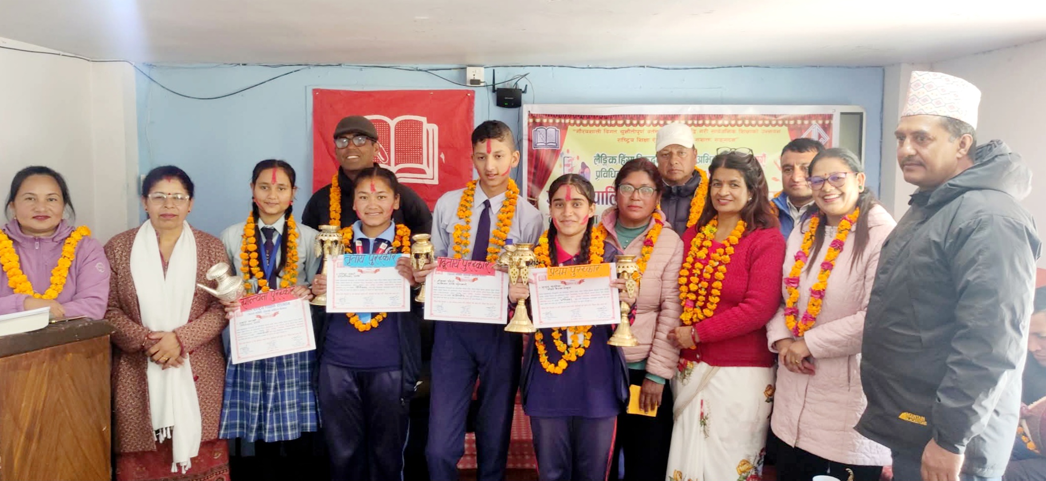 अगेनो न्यूज ःमंसिर २०- दोलखाको सदरमुकाम चरिकोटमा लैङ्गिक हिंसा अन्त्यका लागि सरोकारवालाको भुमीका विषयक अन्तर पालिका माध्यमिक विद्यालय स्तरीय वक्तृत्वकला प्रतियोगीता सम्पन्न भएको छ । नेपाल राष्ट्रिय शिक्षक सङ्गठन जिल्ला समिति दोलखाको महिला विभागको आयोजनामा चरिकोटमा रहेको द राइजिङस्टार इङ्लिस बोर्डिङ स्कुलमा भएको प्रतियोगीतामा मोर्डन नेपाल बोडिङ स्कुल चरिकोटका कुसुम थपलिया प्रथम,कालीनाग मावि सुनखानीका श्रीकृष्ण उप्रेती द्धितिय,हनुमन्तेश्वर मावि मैनापोखरीका मनिषा खत्री तृतिय र गोल्मेश्वर मावि मालुका प्रकृति कार्की सान्त्वना हुनुभएको छ ।“लैङ्गिक हिंसा विरुद्धको १६ दिने अभियान सफल पारौं, प्रविधिको सहि प्रयोग गरौँ लैङ्गिक हिंसा अन्त्य गरौँ”भन्ने मुलनाराका साथ भएको प्रतियोगीता विजयी प्रतियोगीहरुलाई शैक्षिक सामग्री प्रदान गरिएको थियो । प्रतियोगीतामा जिल्लाका पालिकामा भएको लैङ्गिक हिंसा अन्त्यका लागि सरोकारवालाको भुमीका विषयक पालिका स्तरीय प्रतियोगीतामा प्रथम हुनुभएको ८ जना प्रतियोगीहरुको सहभागीता रहेको थियो । नेपाल राष्ट्रिय शिक्षक सङ्गठन दोलखा महिला विभागका संयोजक पम्फामाया श्रेष्ठको अध्यक्षतामा भएको कार्यक्रममा सङ्गठनका जिल्ला समितिका अध्यक्ष किशोर दाहाल,भीमेश्वर नगरपालिकाका उपप्रमुख कमला,मेलुङ गाउँपालिकाका उपाध्यक्ष गायत्री आचार्य,सङ्गठनका लेखा समिति संयोजक केशब सेढाईं,सङ्गठनका कालिन्चोक गाउँपालिका अध्यक्ष चित्र बहादुर खड्का,मेलुङ गाउँपालिकाका अध्यक्ष शिखर भण्डारी,बैतेश्वर गाउँपालिकाका अध्यक्ष सुरेन्द्र पोखरेल,निर्णायक समिति संयोजक समीरा बस्नेत र जिल्ला समिति उपसचिव अम्बिका कार्की लगायतले मन्तव्य राख्नुभएको थियो ।